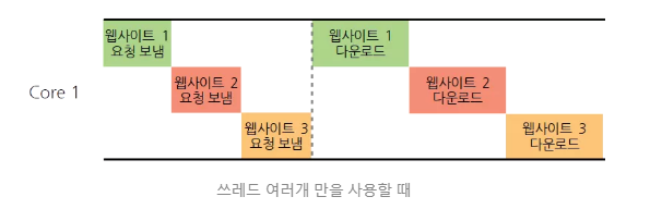웹사이트를 다운받는 것과 같이 대기시간이 긴 작업을 수행할 때, 여러 개의 쓰레드를 사용하면 더 효율적으로 작업할 수 있음.