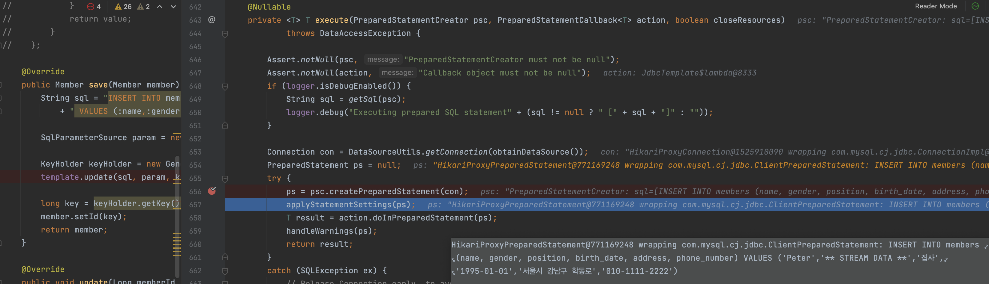 debugger 를 이용해 template.update 메서드 로직 오류를 추적해보면, 아래와 같은 쿼리가 생성되는 것을 확인할 수 있다.