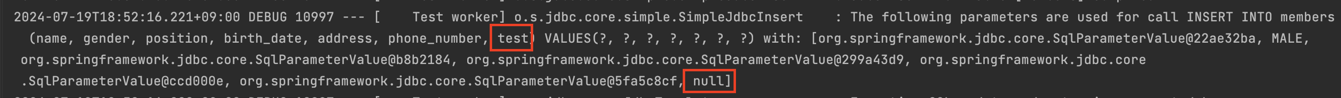 insert 문은 SimpleJdbcInsert 생성 시 명시한 withTableName, usingGeneratedKeyColumns 를 통해 테이블 정보를 읽어서 만들어 주는 것 같다.