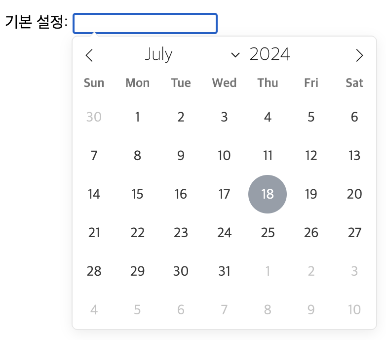 위 코드를 실행하고 input 필드를 누르면 아래와 같이 캘린더 기반 Date Picker 를 볼 수 있다.