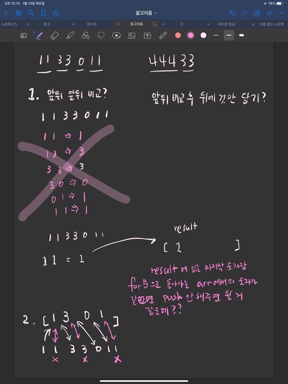 앞뒤 비교를 해보려 했다. 그러다가 빈 배열에 숫자를 하나 넣고 그 다음 숫자가 같으면 넣지않고 다르면 넣고 하면 된다는 걸 캐치.