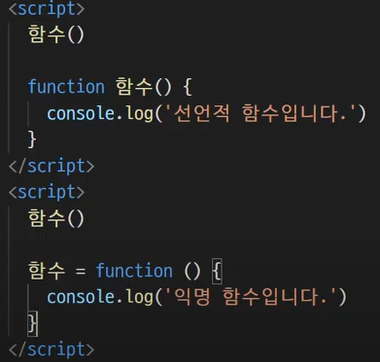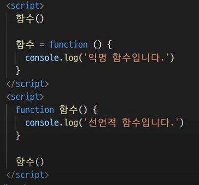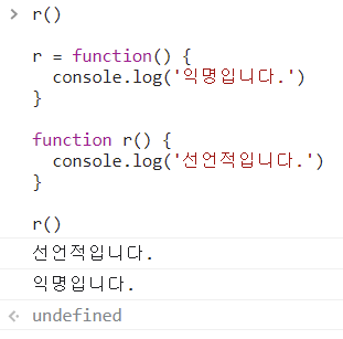 둘다 같이 쓰게 된다면? 선언적 함수가 먼저 들어가고 익명함수가 나중에 들어간다.