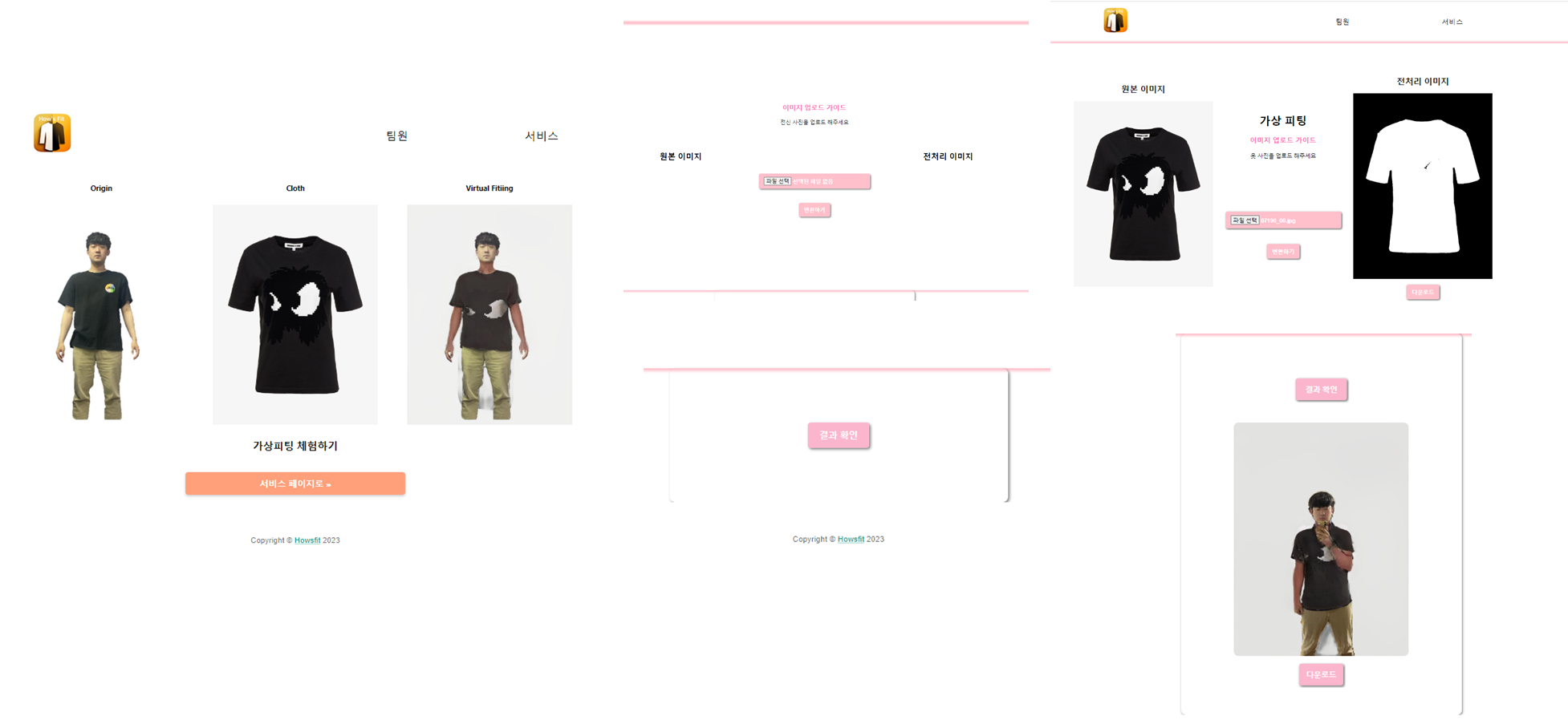 서비스 화면에 옷사진과 사람사진만 넣으면 가상피팅이 가능하도록 만들었다. 가상 피팅 결과 사진은 다운로드 해 사용자가 저장할 수 있도록 했다.