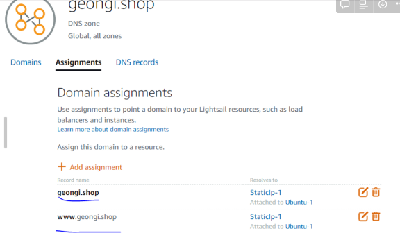 NS 등록후 Assignments와 DNS record를 확인하고, 위와 같이 설정했다.
