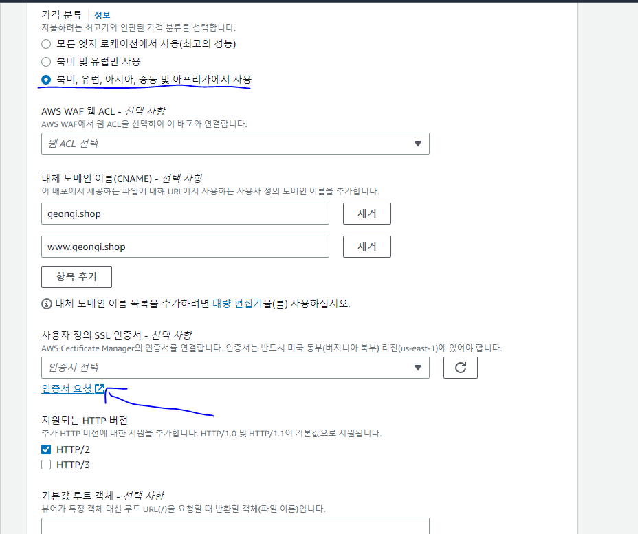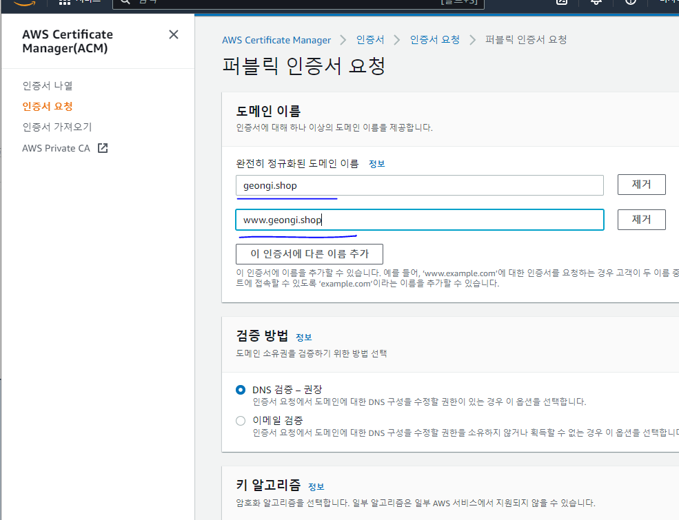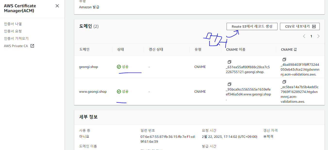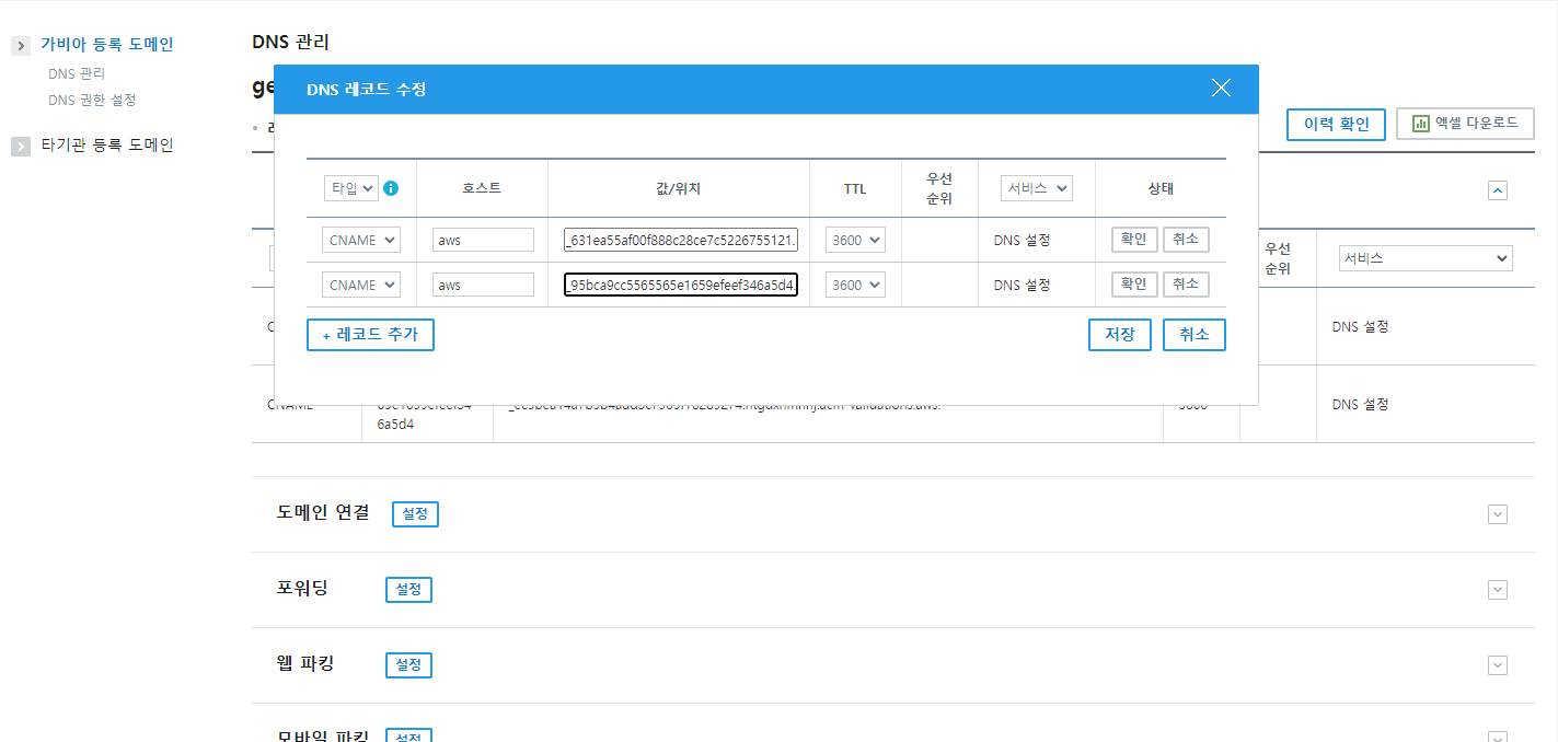 호스트에 aws / 값 위치에 aws certificate의 cname 이름 넣고 승인 기다리기