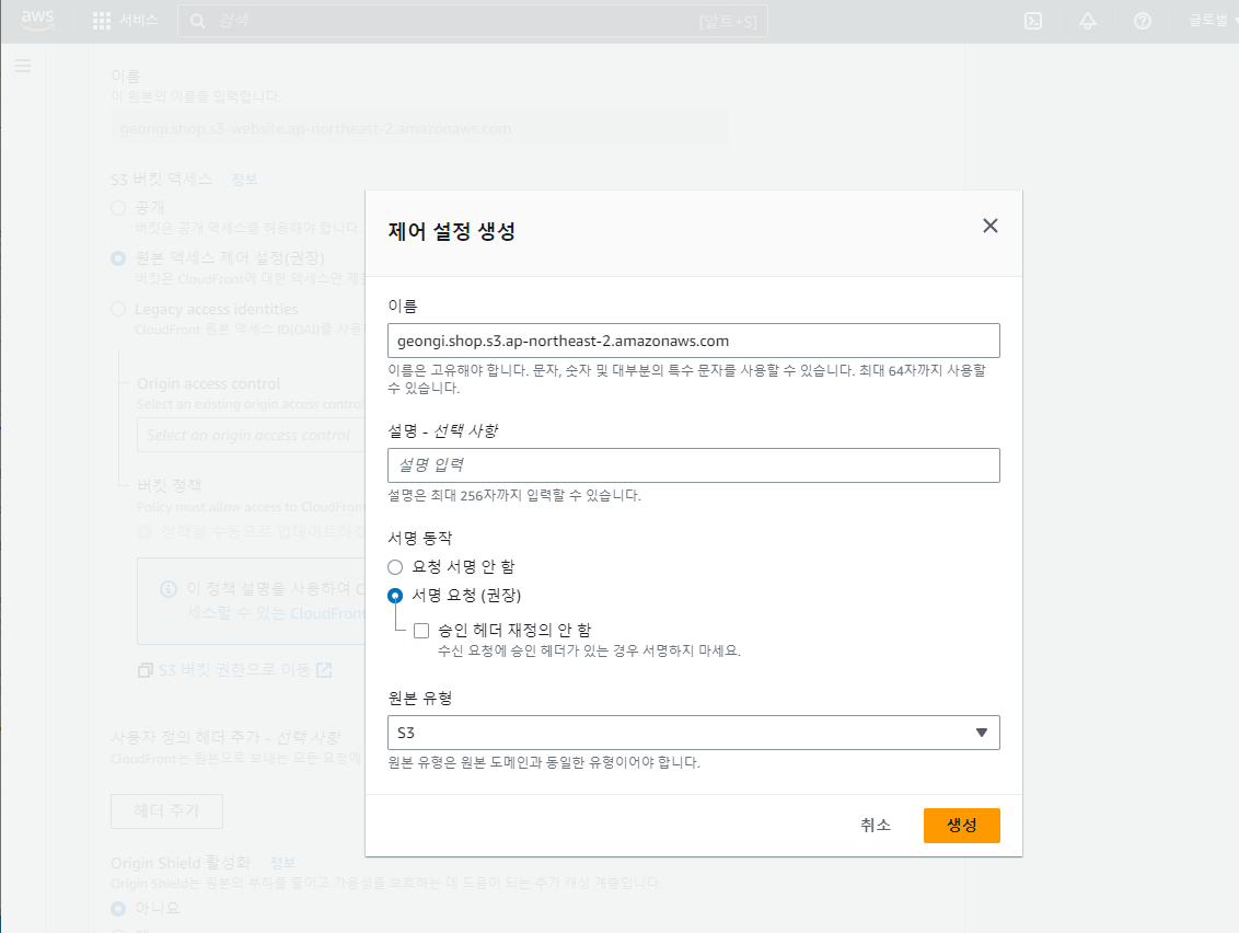 원본 도메인에서 // original access control 설정 해주기 // 제어 생성 누르면