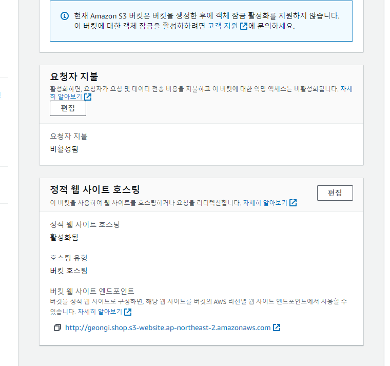 버켓→ 속성 → 정적웹사이트 호스팅→ 정적 웹사이트 호스팅 인덱스 문서