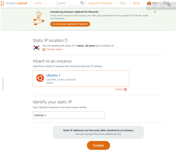 Lightsale Networking에서 static ip를 생성했다.
