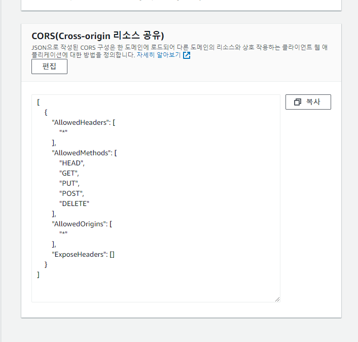 권한 → 버킷정책, CORS