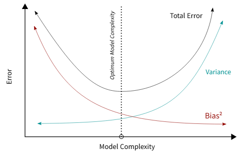 노이즈의 분산이 고정되어 있다는 전제 하에서, 오차의 기댓값을 줄이려면 bias와 variance를 줄여야 한다. 하지만 모델의 복잡도 축에서 bias와 variance는 trade off되는 경향이 있다.