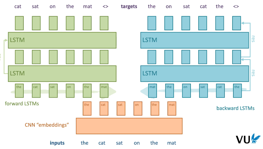 전방향과 역방향에서 토큰 representation 와 softmax 층 는 공유하지만 LSTM 파라미터 자체는 각 방향에서 분리하여 관리합니다.