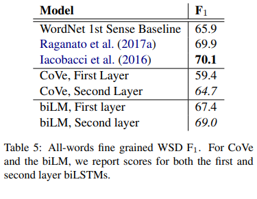 Table 5는 Raganato et al. (2017b)에서 제시한 평가 지표를 적용하여 biLM의 결과를 비교한 표입니다. 테스트 데이터는 논문에 나온 네 개의 데이터셋을 그대로 사용했고 biLM의 top layer의 값은 69.0의 F1-score 값으로 biLM의 첫 번째 레이어보다 뛰어난 성능을 보였습니다.