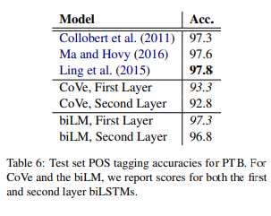 biLM이 기초 구문을 파악하는지 확인하기 위해 context representation을 POS tag 예측을 위한 선형 분류기(linear classifier)에 입력으로 사용하였습니다. 사용된 코퍼스는 Penn Treebank(PTB)입니다.