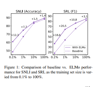또한, ELMo를 부착한 모델은 적은 훈련 데이터셋으로도 효율적으로 사용할 수 있습니다. Figure 1을 살펴보면 ELMo를 사용했을 때 성능 향상이 데이터셋이 적을 때 가장 크게 나타났고, 데이터의 양이 늘어날 수록 그 효과가 점점 적어졌습니다. 예시로 SRL의 경우, ELMo에서 1%의 훈련 데이터로 얻은 F1-score가 baseline 모델에서는 10%의 훈련 데이터를 사용한 결과와 같습니다.