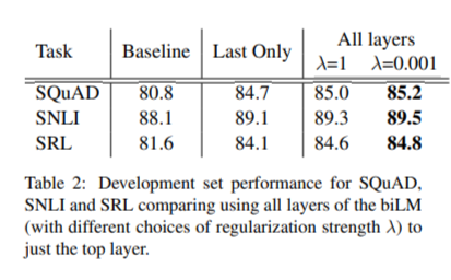 이는 SNLI와 SQuAD architecture가 biRNN 후에 attention 층을 사용하기 때문에 ELMo를 해당 레이어에 부착하는 것이 모델로 하여금 biLM의 내부 representation에 더 주의를 기울일 수 있게 하는 것입니다.