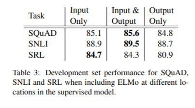 Table 3을 보면, SNLI와 SQuAD에서는 입력층과 출력층 모두에 ELMo를 부착하는 것이 입력층에만 부착하는 것보다 높은 성능을 보였습니다. 하지만 SRL에서는 입력층에만 부착하는 것이 가장 높은 성능을 보였습니다.