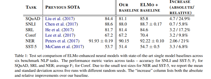 전체적으로 6개의 벤치마크에서 ELMo를 추가하는 것만으로 SOTA(state-of-the-art)를 달성한 것을 볼 수 있습니다.