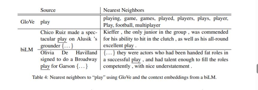 Table 4에는 'play'란 단어를 기준으로 GloVe에서의 의미와 biLM에서의 의미를 비교하고 있습니다. GloVe에서는 파생표현(-ing나 명사 등등)도 존재하지만 기준 의미가 스포츠의 'play'인 반면, biLM에서는 문장에서의 'play'의 품사와 의미 모두 판별할 수 있음을 보여줍니다.