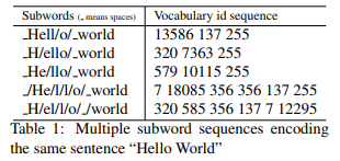 BPE을 기반으로 한 segmentation은 단어 집합 크기와 디코딩 효율성 모두 챙길 수 있었습니다. 하지만, 같은 단어 집합이더라도 문장이 여러 subword sequence로 표현될 수 있었습니다.
