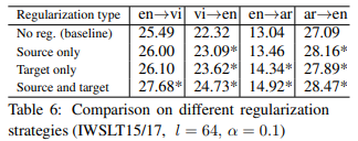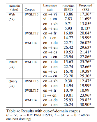 표 3의 증가폭과 비교했을 때, out-of-domain에서의 subword regularization 사용이 2 포인트 정도 더 증가폭이 컸습니다. 또한 조금의 증가가 있었던 데이터셋(WMT14)에서조차 큰 폭의 증가를 보였습니다. 이는 subword regularization이 open-domain에서 강점을 보인다는 점을 뒷받침합니다.