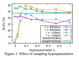 또한, 일때 유독 성능이 떨어지는 경향을 보였습니다. 이는 segmentation 확률인 가 에서는 무시되고, 하나의 segmentation만 샘플링 되기 때문입니다. 이는 편향된 샘플링이 실제 노이즈를 반영하여 번역에 도움이 된다는 점을 시사합니다.