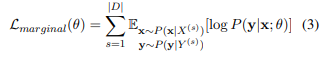 소스 문장과 타겟 문장 X와 Y는 segmentation 확률 와 를 각각 가진 여러 subword sequences로 나뉠 수 있습니다. 로그 가능도를 marginalize likelihood로 최적화하면 아래와 같은 식이 나옵니다.