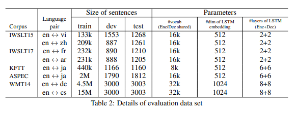 소형 코퍼스: IWSLT15/17, KFTT(언어 독립성 평가 가능)