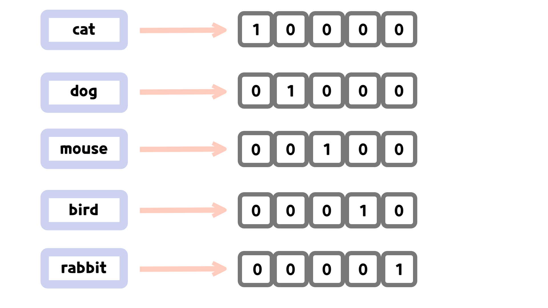 one-hot encoding의 경우 단어를 희소 표현(sparse representation)으로 나타냅니다. 즉, 0과 1로만 구성된 벡터로 구성하는 것입니다.