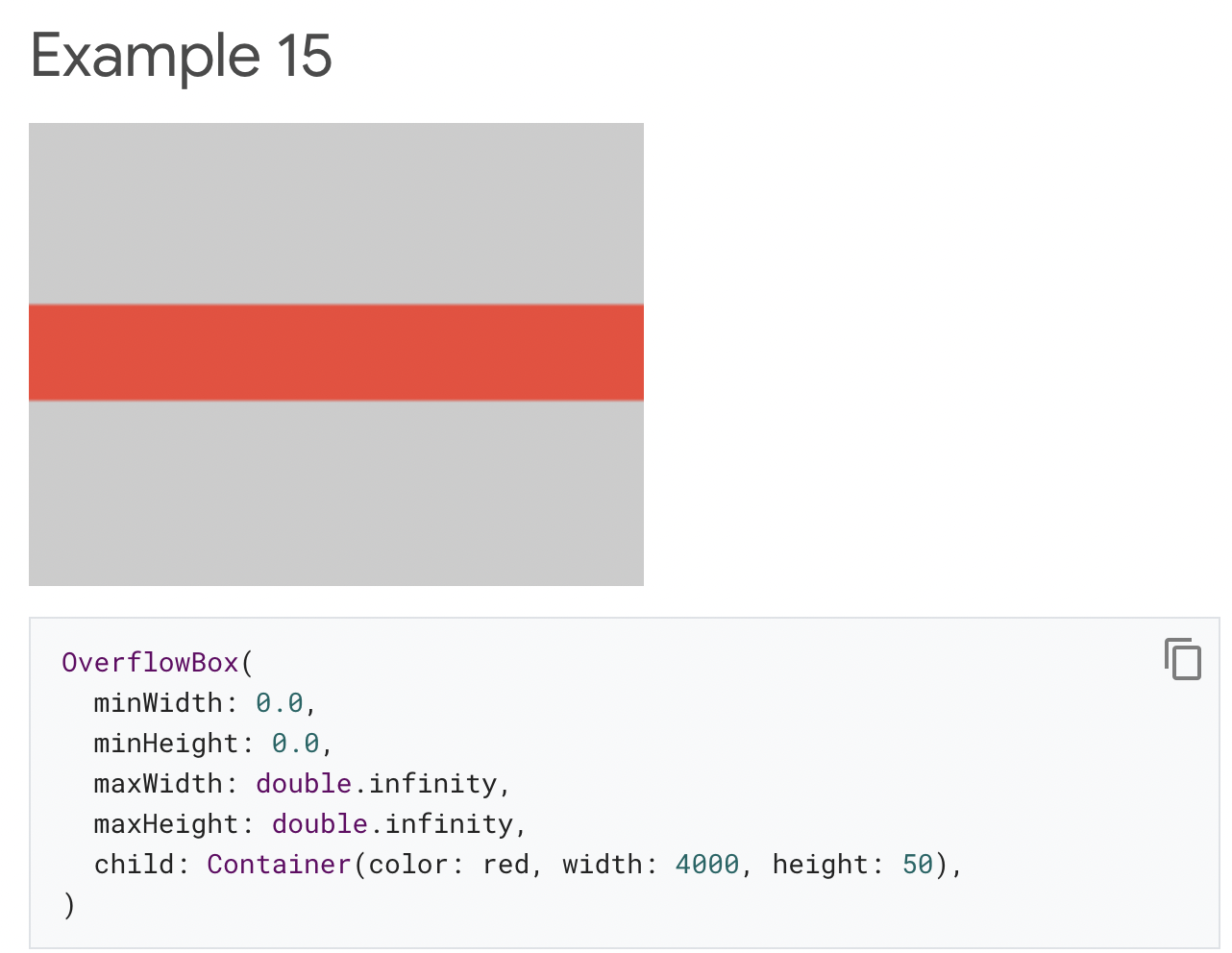- `OverflowBox` is similar to `UnconstrainedBox` ; the difference is that it won’t display any warnings if the child doesn’t fit the space.</b>|