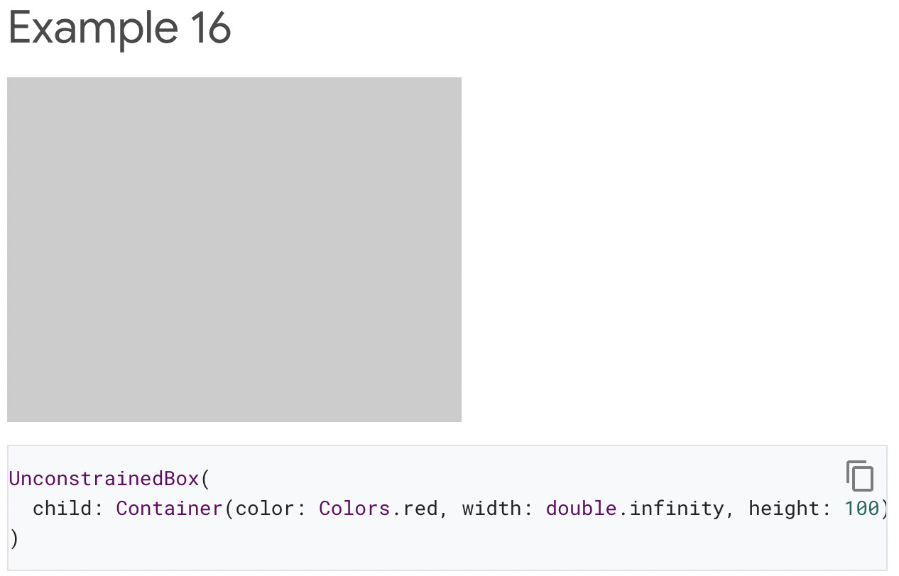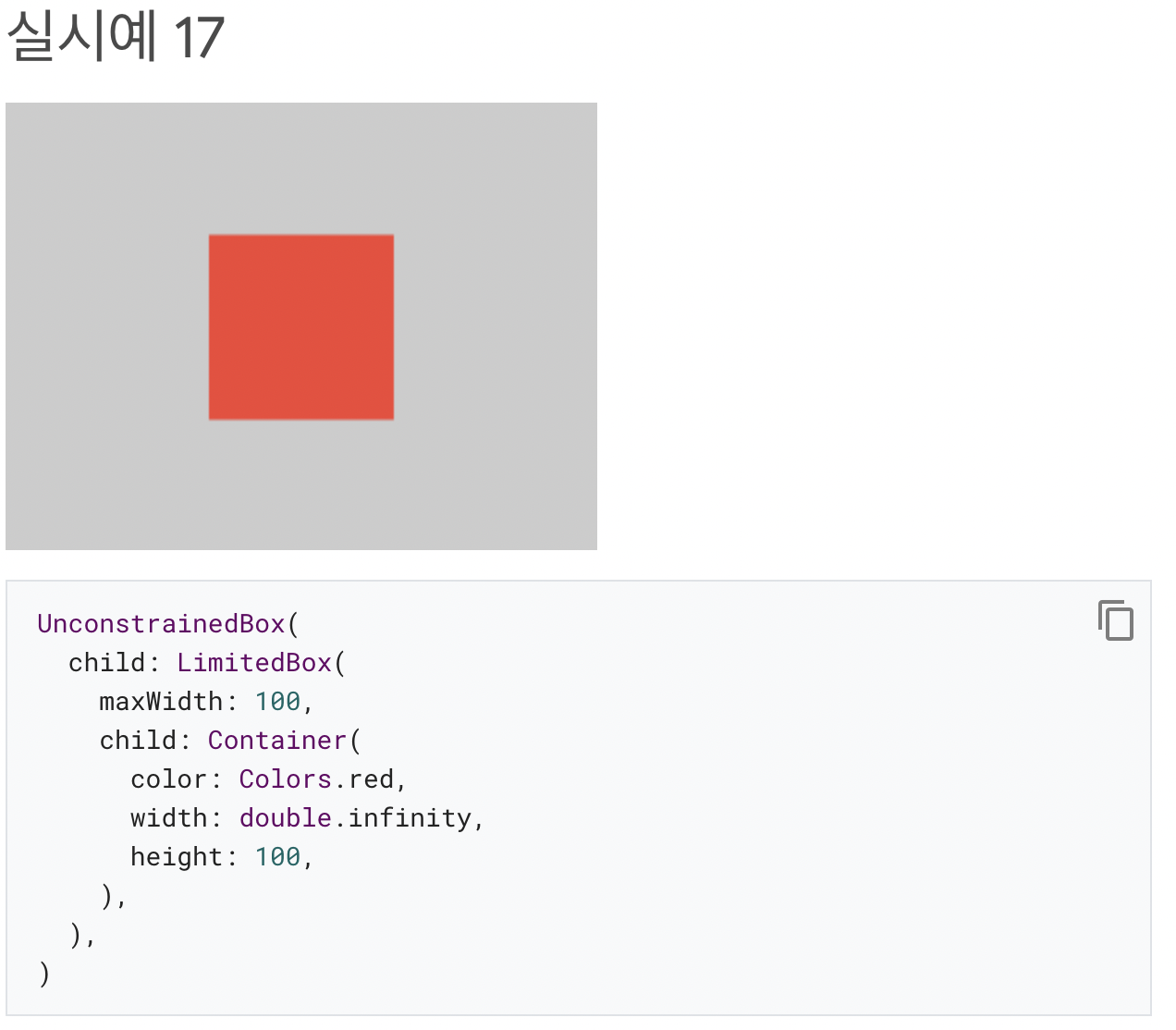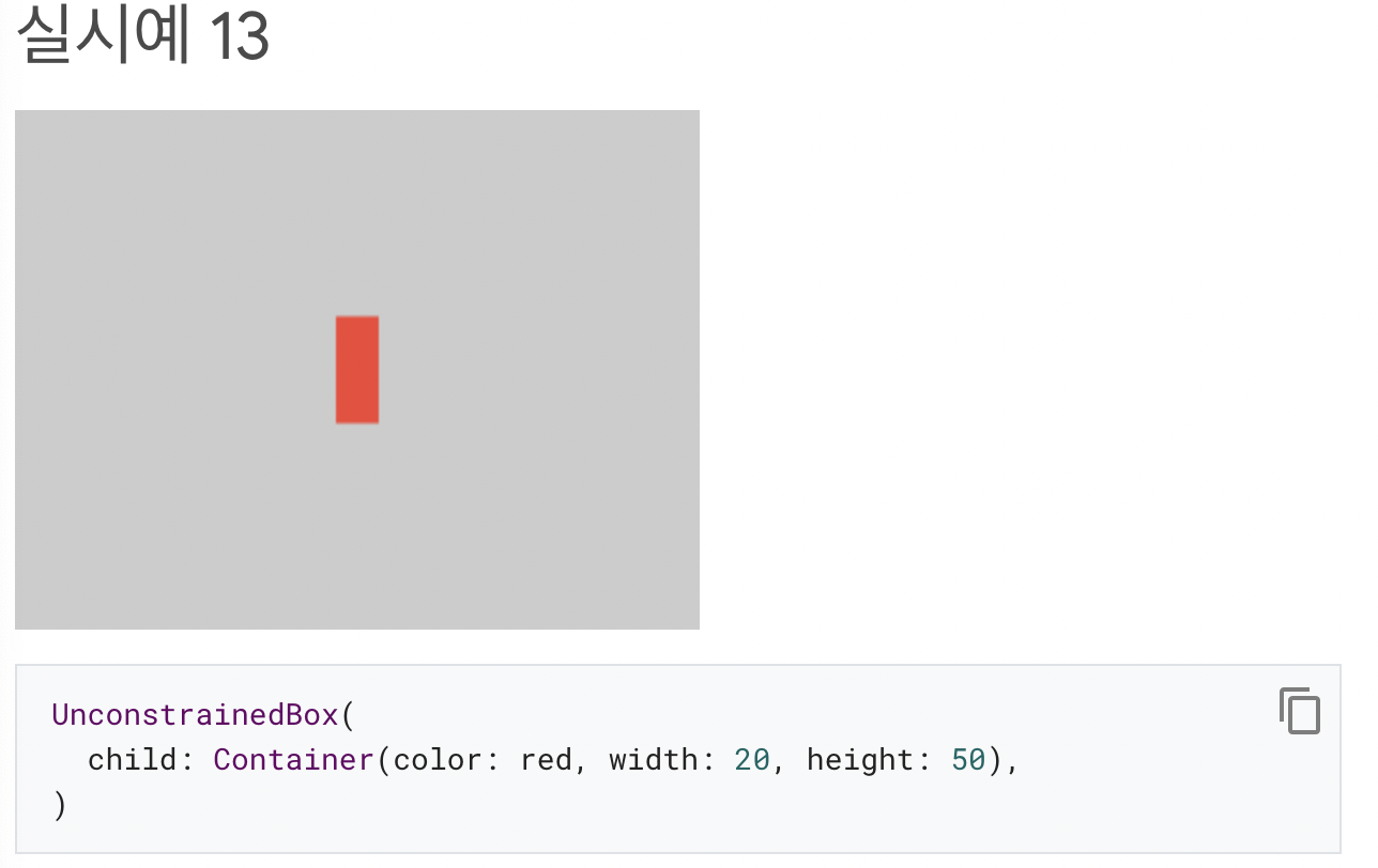 - `UnconstrainedBox`자식을 원하는 크기로 만들 수 있지만 child의 width 속성은 부적절합니다.