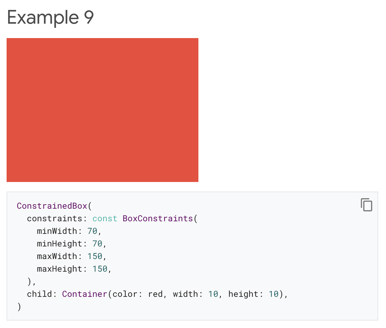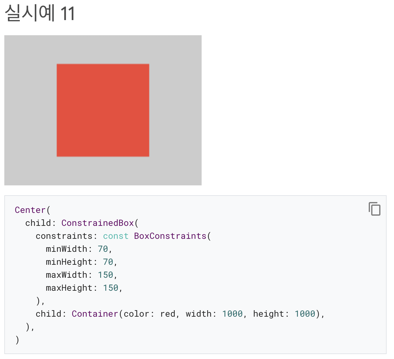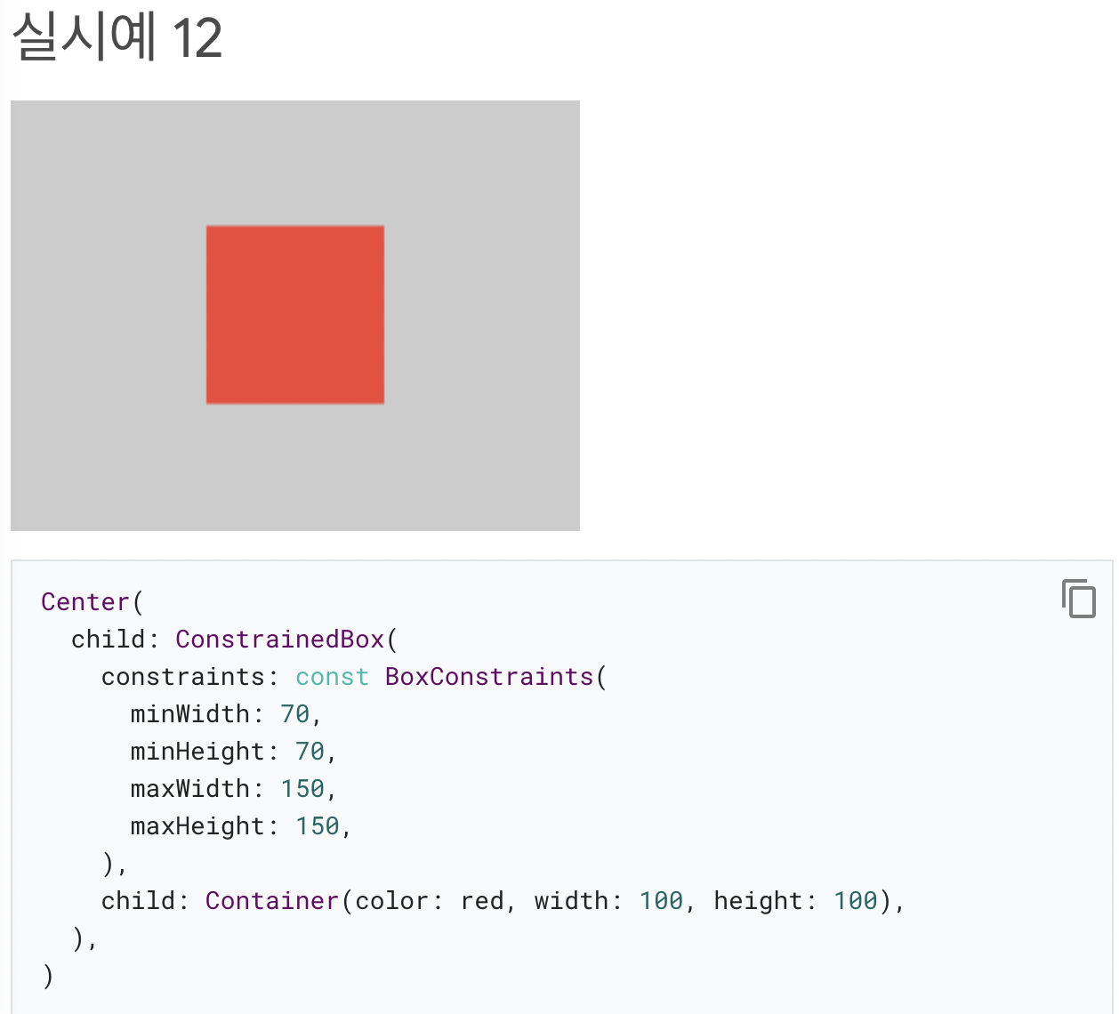|<b>child Container는 parent ConstrainedBox minSize, maxSize에 포함되는 100 x 100 사이즈를 차지하게 됩니다.</b>|