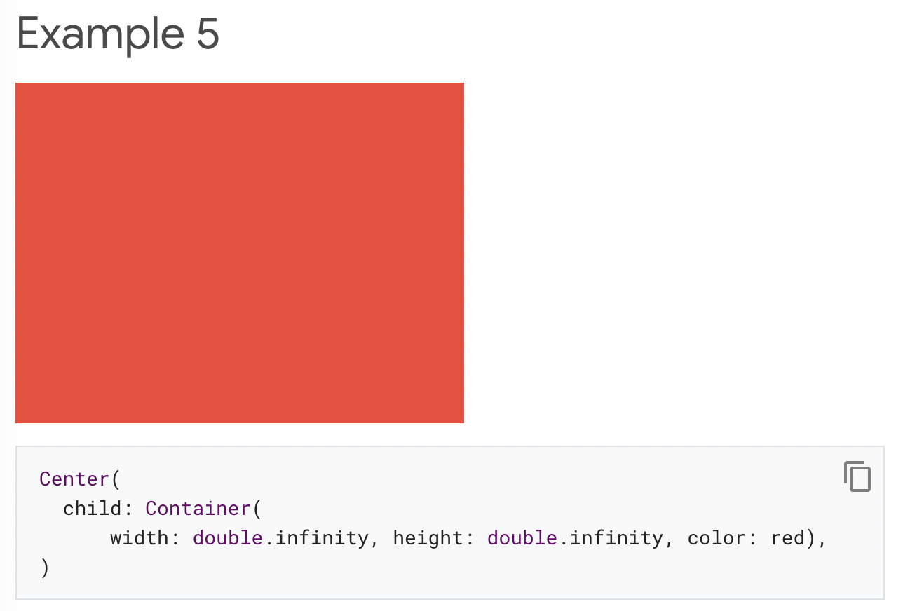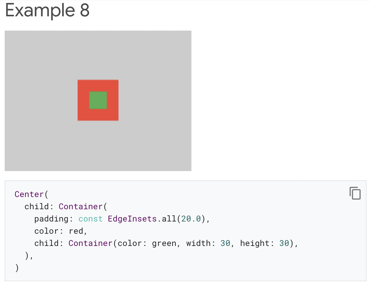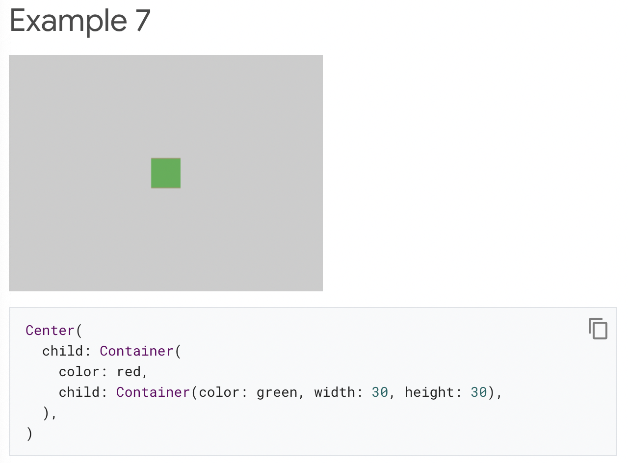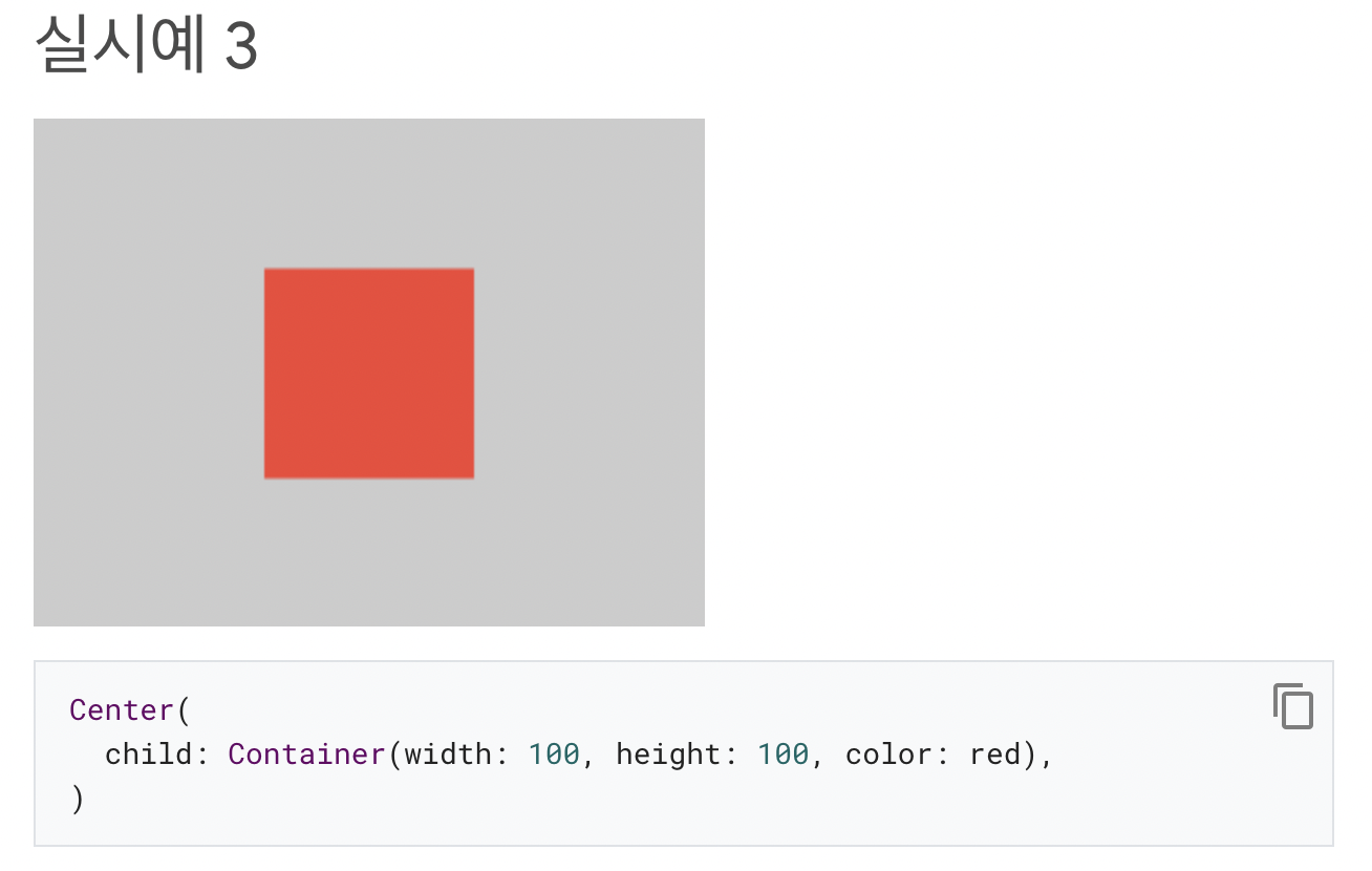 Center 위젯은 Container 위젯에게 Screen보다 큰 사이즈일수는 없더라도 원하는 사이즈를 가질 수 있게 허용합니다. 따라서 Container는 100 x 100 사이즈를 갖습니다.</b>|