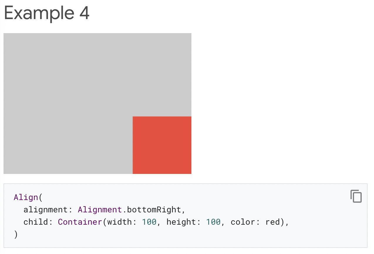 Align 위젯은 Container에게 원하는 사이즈를 부여할 수 있습니다. 다만, 회색영역과 같이 빈공간이 있는 경우, Container는 중앙에 배치될 수 없습니다.</b>|
