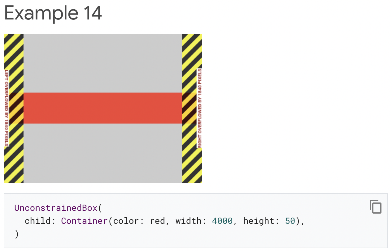 |<b>Unfortunately, in this case the `Container` is 4000 pixels wide and is too big to fit in the `UnconstrainedBox`, so the `UnconstrainedBox` displays the much dreaded “overflow warning”.</b>|