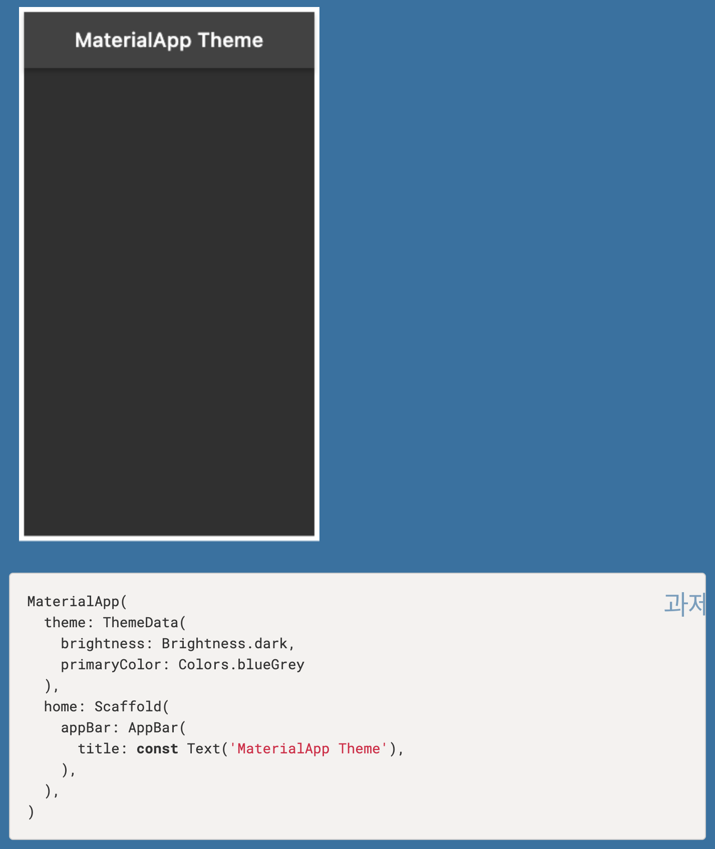 AnimatedTheme 및 GridPaper 와 같은 머티리얼 디자인 관련 기능을 추가 하여 WidgetsApp 을 기반으로 한다.