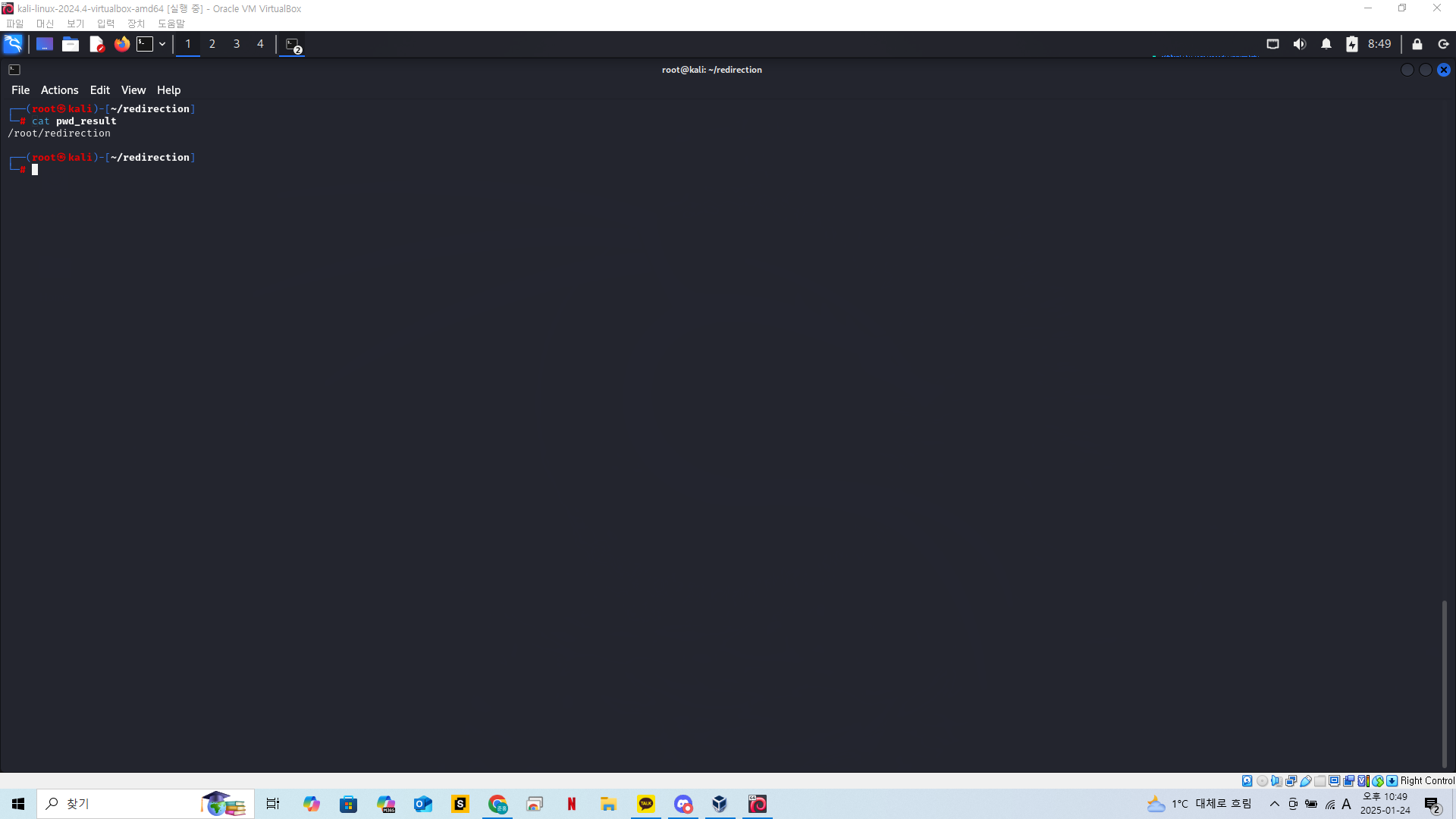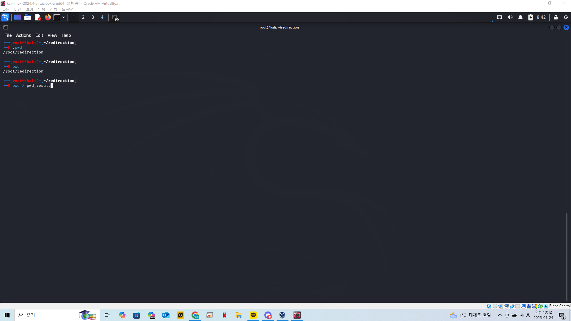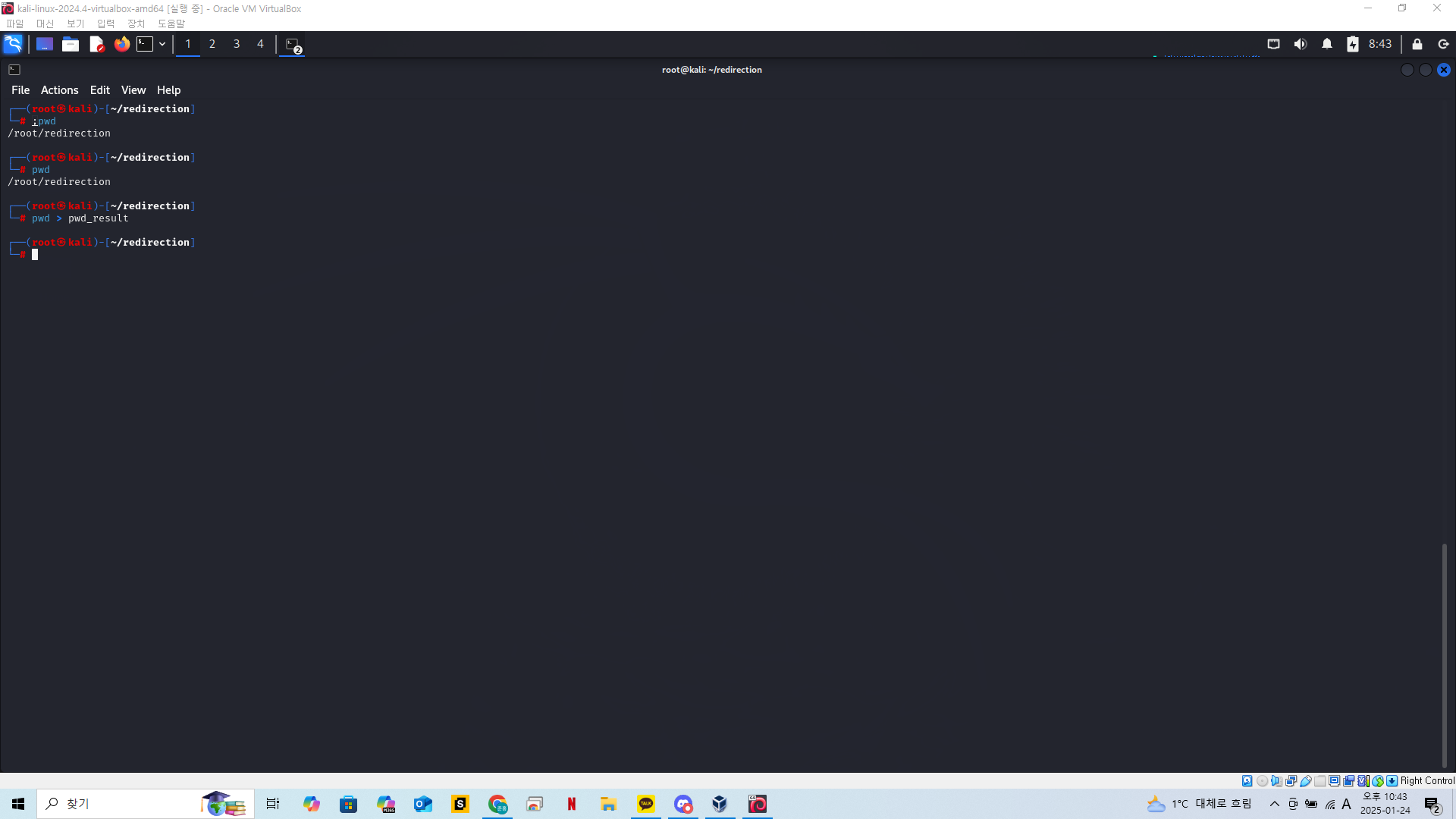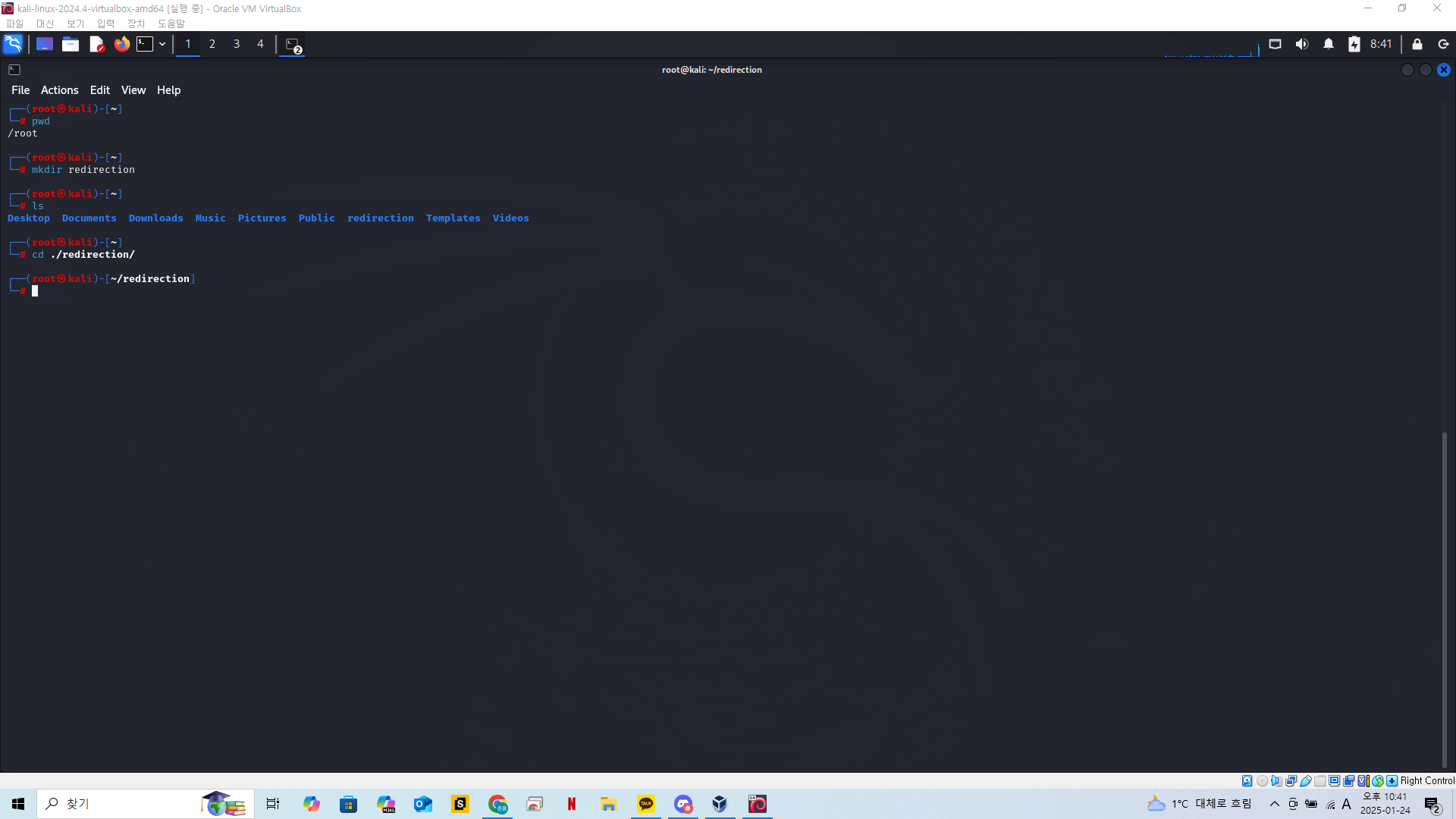 실습을 위해 redirection 이라는 폴더를 만들고 현재위치를 해당 디렉토리로 옮겨준다.