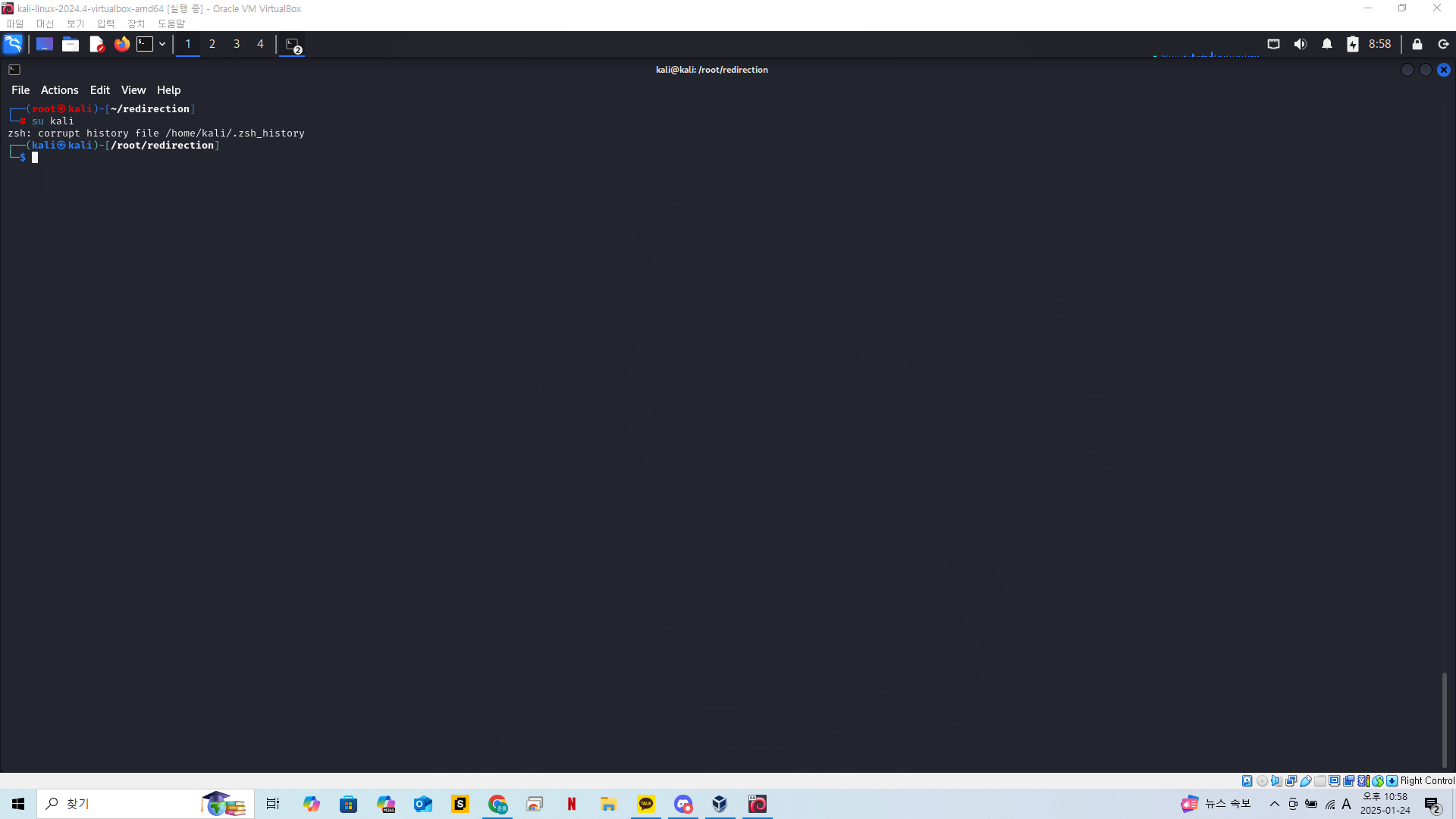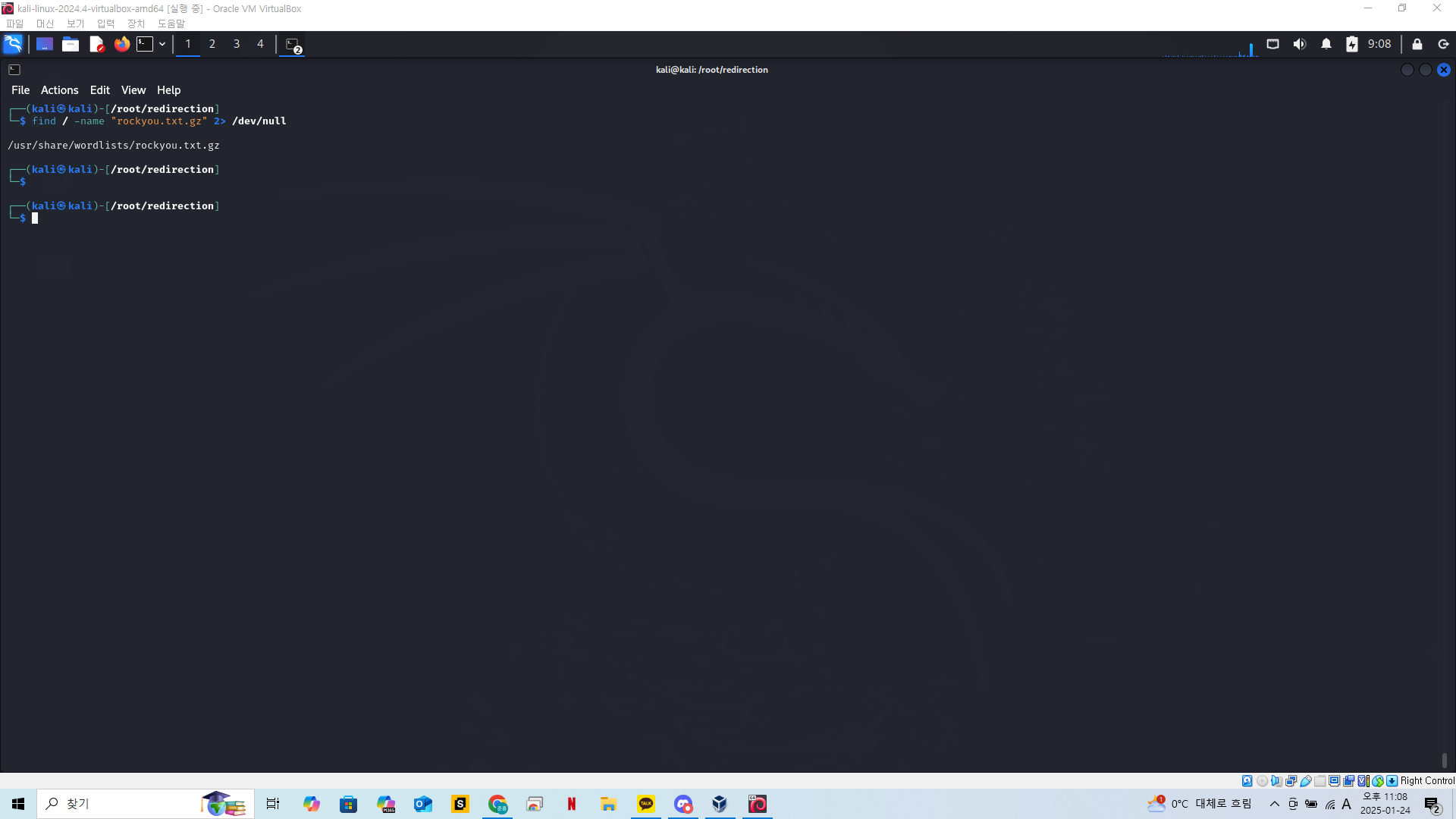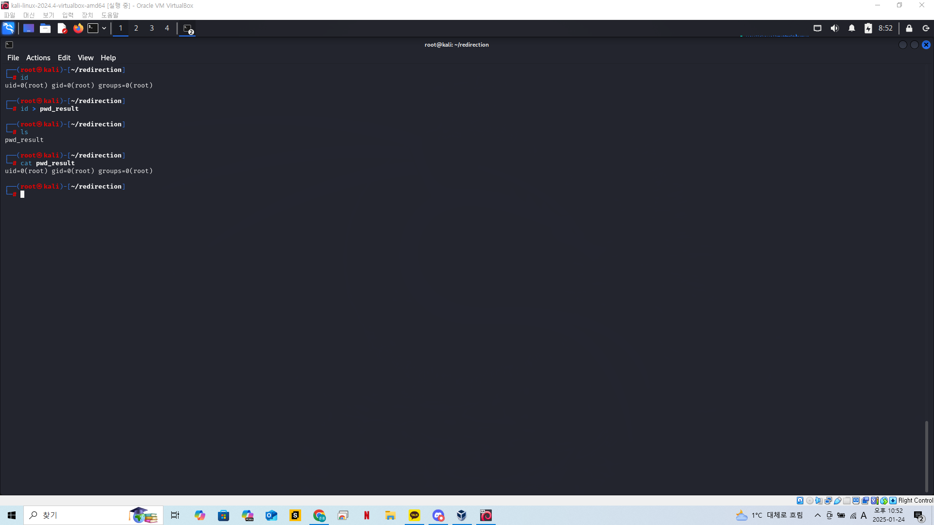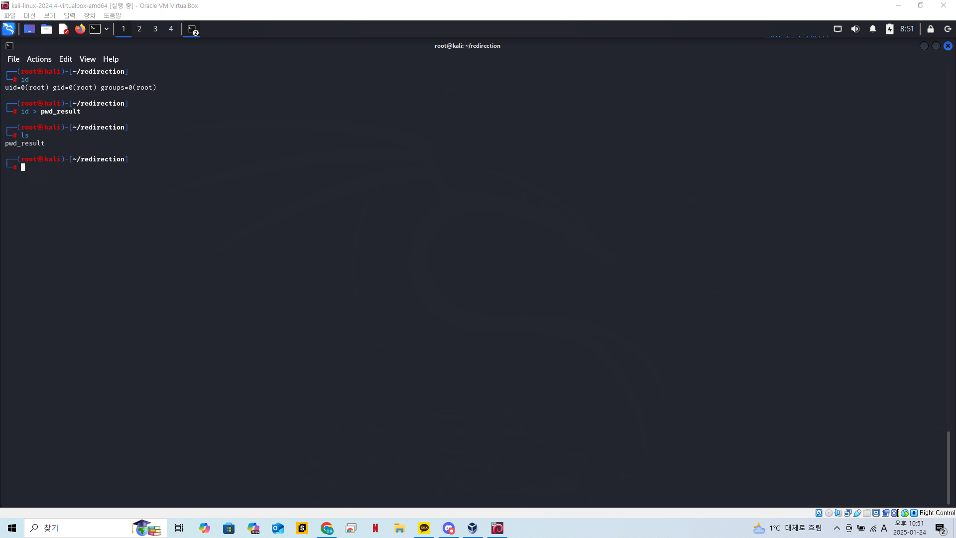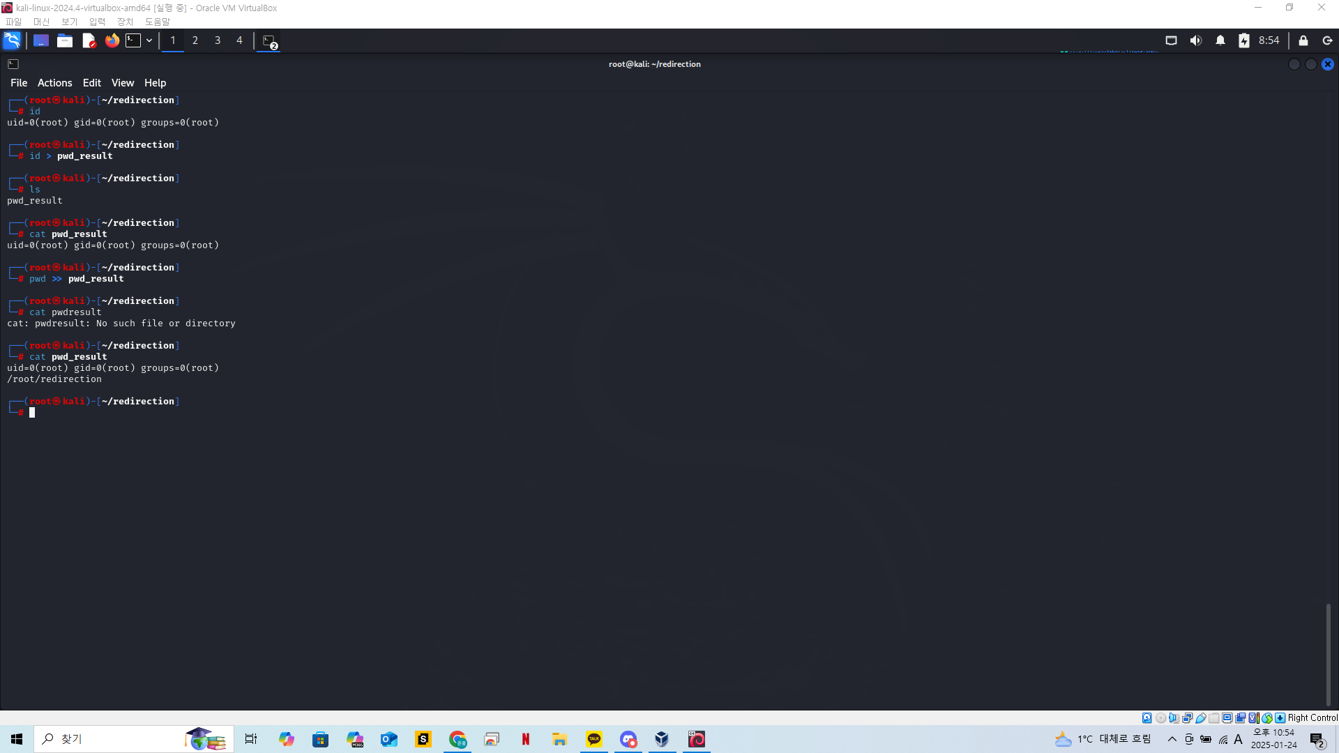 실습을 위해 redirection 이라는 폴더를 만들고 현재위치를 해당 디렉토리로 옮겨준다.