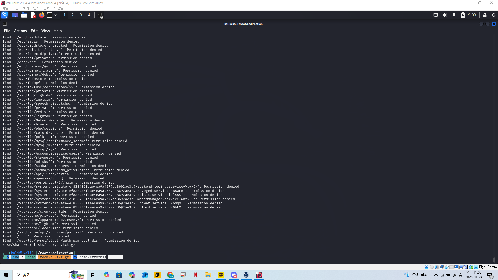 일반 계정으로한 접근이기 때문에 permission denied 가 엄청나게 뜬것을 볼 수 있다.