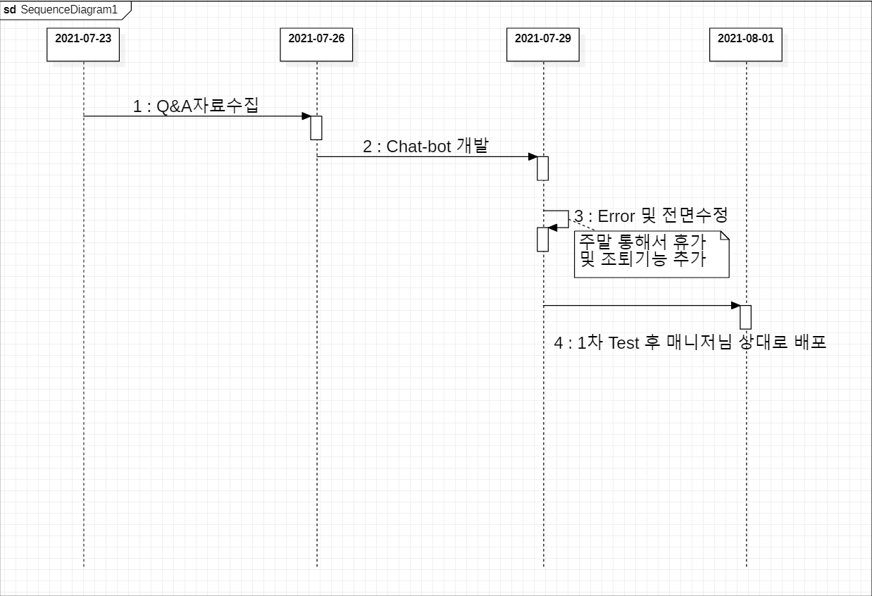 전체 일정을 그렸습니다. 만드는데 일정제한이 있기 때문에 최대한 Chatbot을 간단하고 필요한 기능에 만들기 위해 노력했습니다.