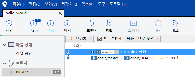 푸쉬는 엄청 쉽습니다. 정상적으로 커밋하면 push 단추에 "1" 이라는 글씨가 써지는데, 이제 푸시 단추를 누르기만 하면 됩니다.