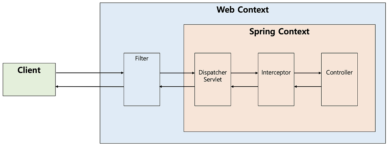 필터는 서블릿 실행 전에 동작하지만 (DispatcherServlet 앞) 인터셉터는 Spring MVC 내부에서 동작합니다.