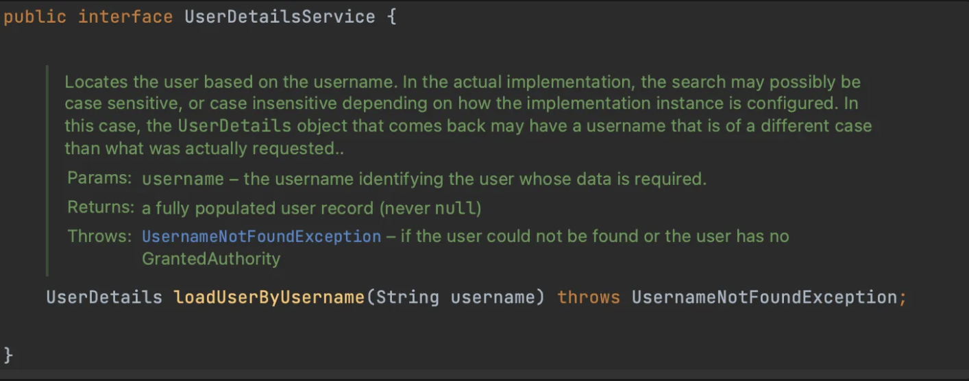 이때 구현체에서 구현하는 retrieveUser 메서드를 통해 DB에서 유저 정보를 가져오게 되는데 이때 사용하는 메서드가 loadUserByUserName 메서드입니다.