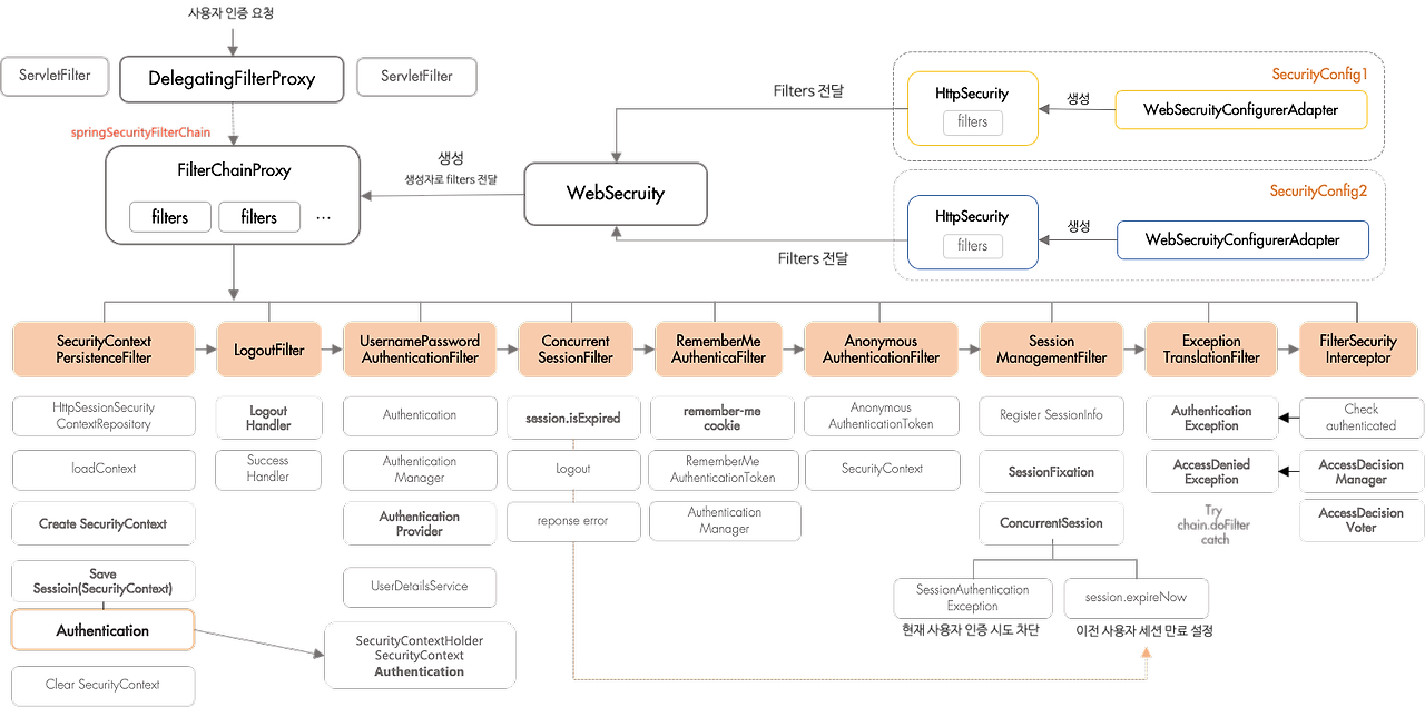 위에서 언급한 SecurityFilterChain의 동작 순서입니다. 이를 통해 인증을 관리합니다.