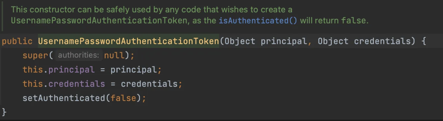 UsernamePasswordAuthenticationToken 는 아이디 비밀번호만 가지고 있고 Authenticated 가 false로 설정되어 있습니다.