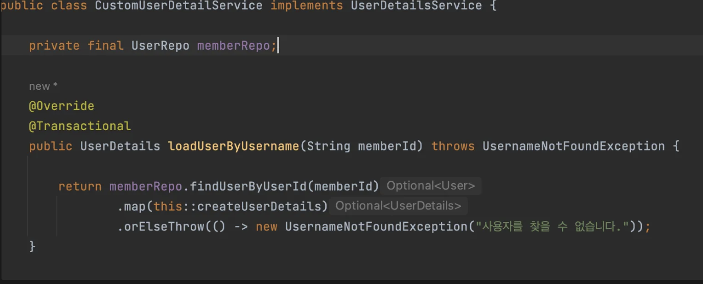 따라서 우리는 UserDetailsService 를 구현하는 구현체를 만들어 등록하면 됩니다.