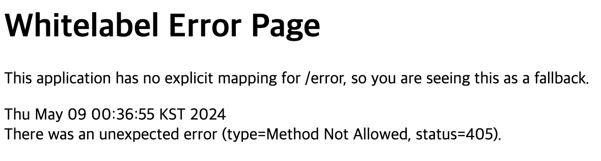 RESTful API 요청을 만들어 보냈다면 스프링은 다음 그림과 같은 화이트라벨 에러 페이지를 보여줍니다.