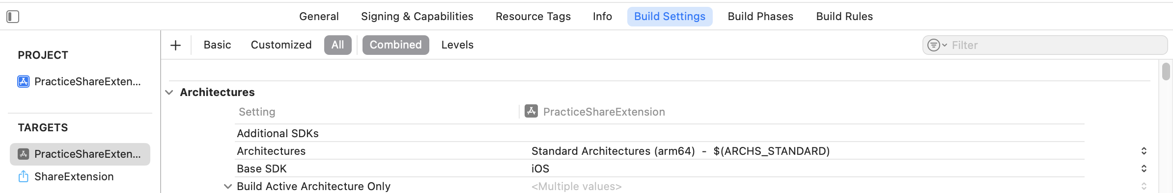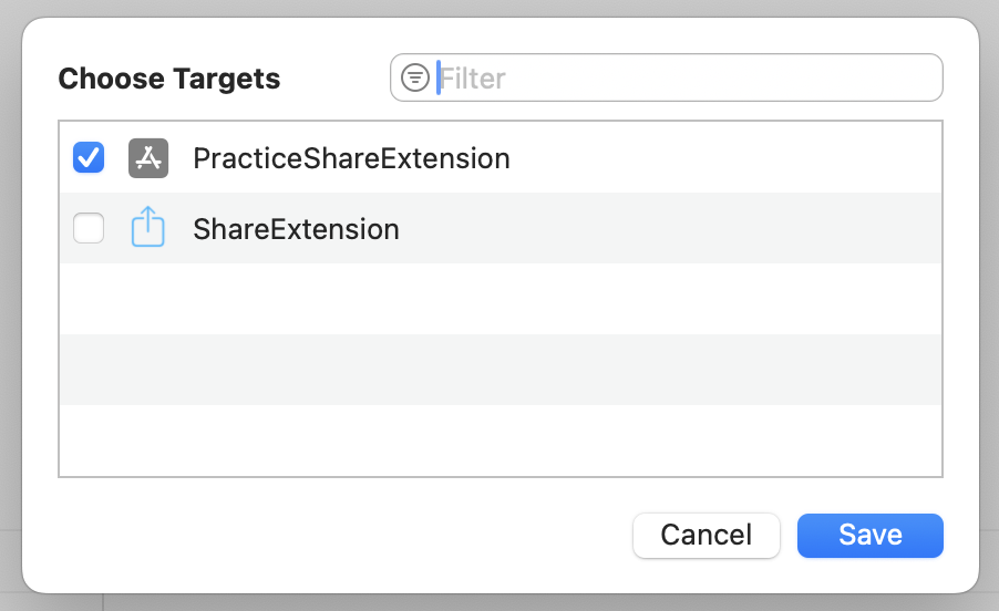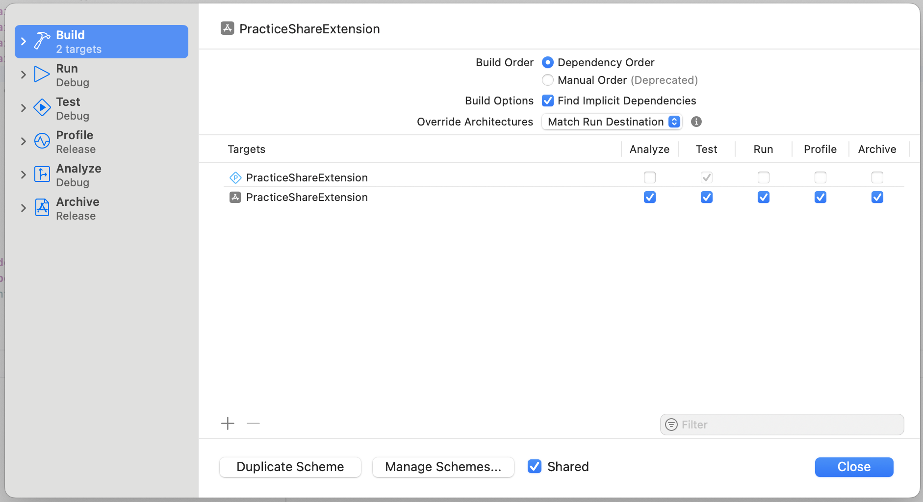이 말이 무슨 말이냐면, 위에 이미지에는 두 개의 타겟(PracticeShareExtension과 ShareExtension)이 있고 PracticeShareExtension앱을 실행할 때 이 두 개의 타겟을 모두 이용할 수 있습니다.