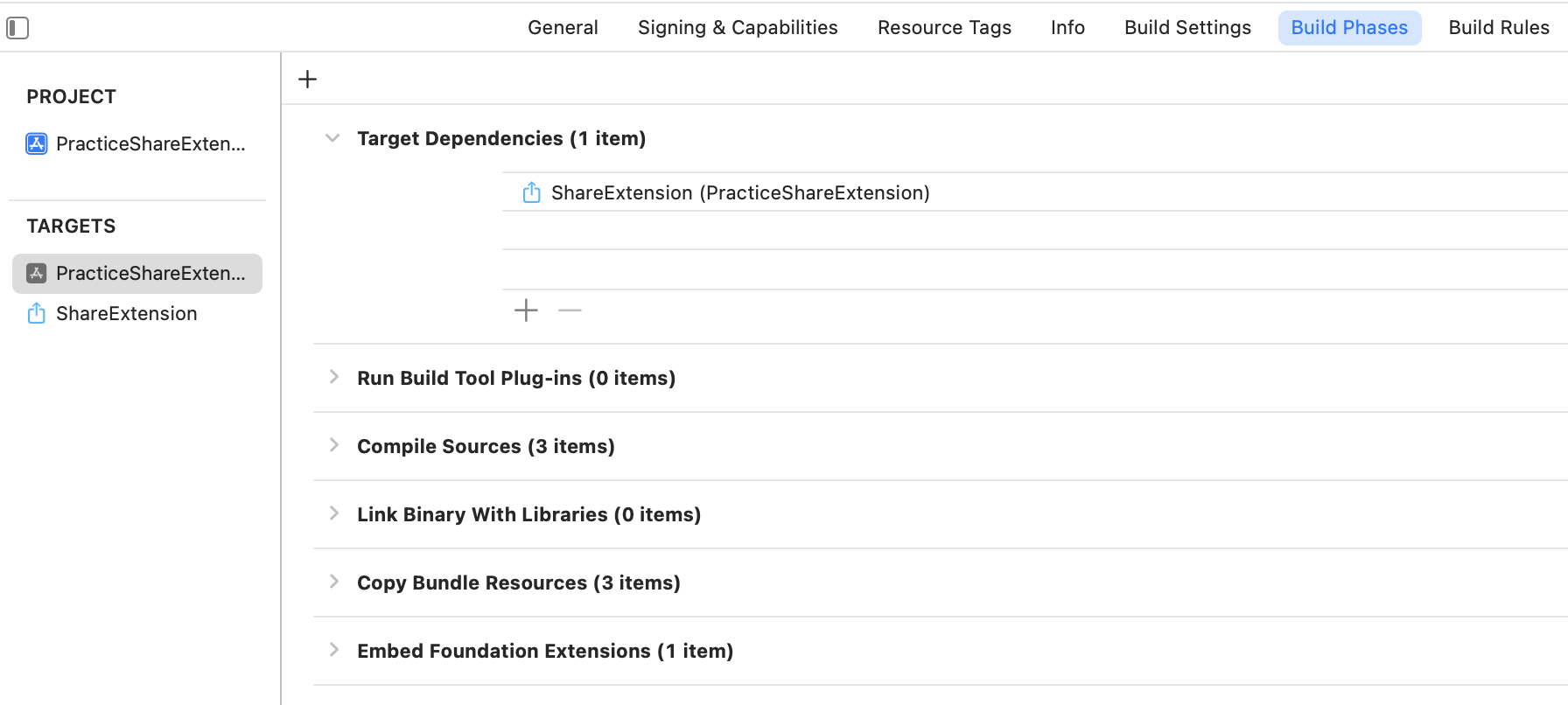 그래서 ShareExtenion 타겟을 만든 후 PracticeShareExtension의 build phase를 보면