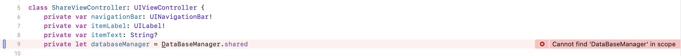 그래서 위와 같이 TargetMembership에 DataBaseManager를 추가하지 않고 사용을 하려고 하면 위와 같은 컴파일 에러가 발생하지만