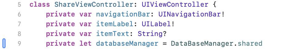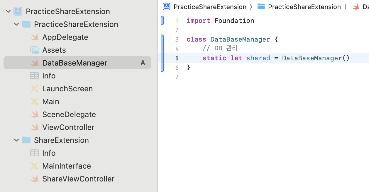 예를 들어 PracticingShareExtension 프로젝트에 외부 데이터베이스를 관리하는 DataBaseManager라는 파일이 있다고 해보겠습니다.